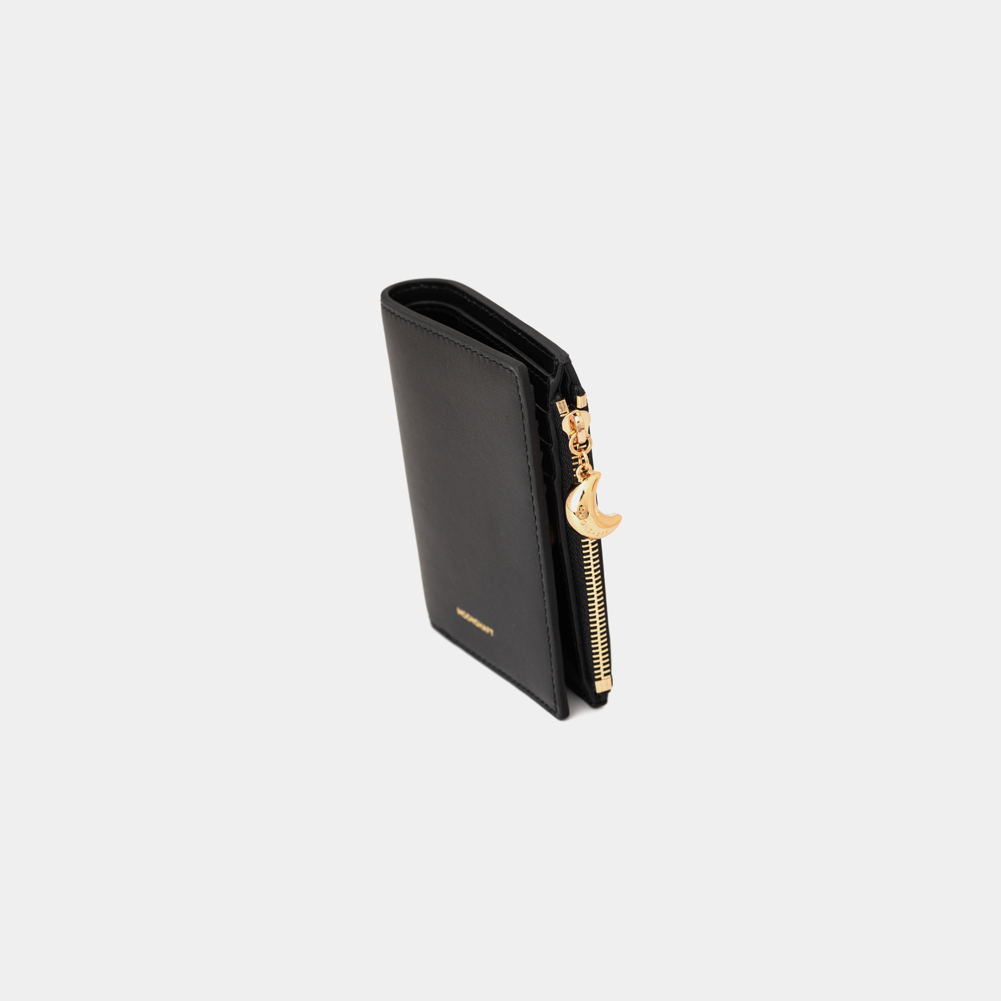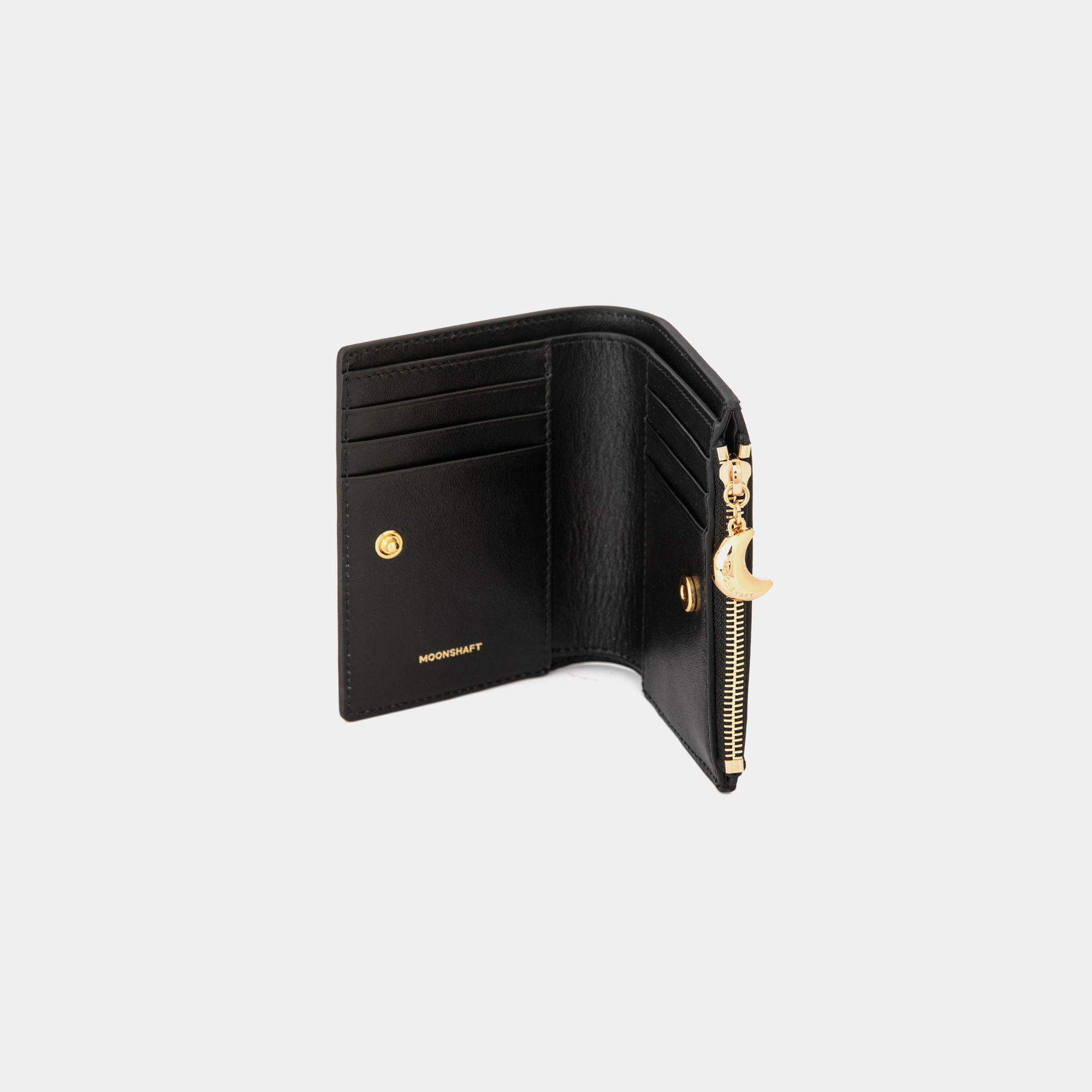 Crescent Bifold Wallet is a slim and compact everyday essential, crafted from full-grain smooth nappa leather. Its classic bifold silhouette opens to reveal neatly arranged card slots and a dedicated bill compartment. A zippered coin compartment adds everyday practicality, finished with a gold-tone metal crescent moon puller, a subtle signature detail that reflects Moonshaft’s design language. Designed to balance function and understated elegance. It is a timeless wallet made for daily use.