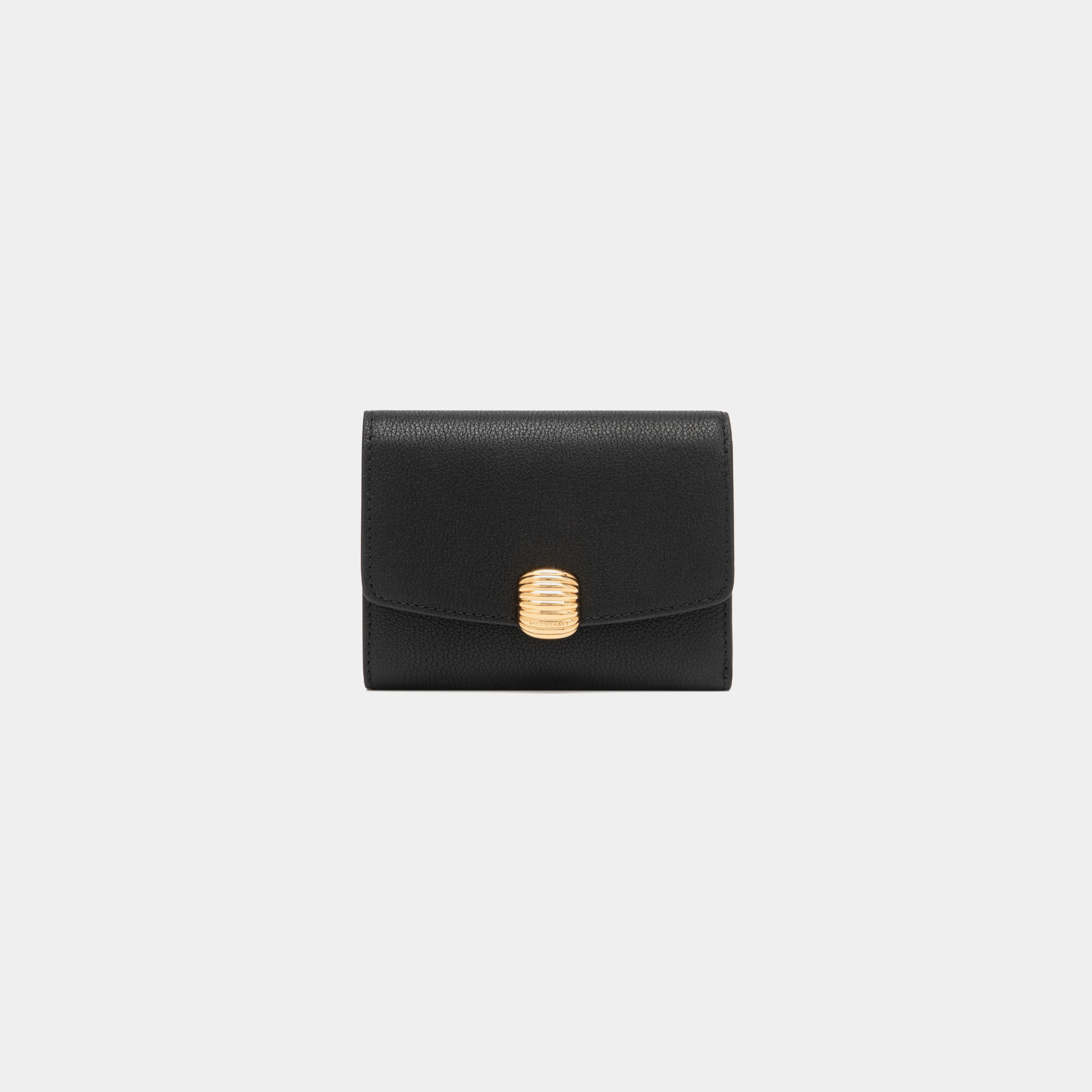 Nebula Trifold 錢包延伸 Nebula 系列對光線、線條與流動感的設計詮釋。採用全粒面頭層粒紋小牛皮製成,並搭配 Nebula 金屬按扣開合設計。Nebula 金屬扣以乾淨俐落的弧形線條塑造,光線掠過其表面時,呈現柔和而流動的光澤。